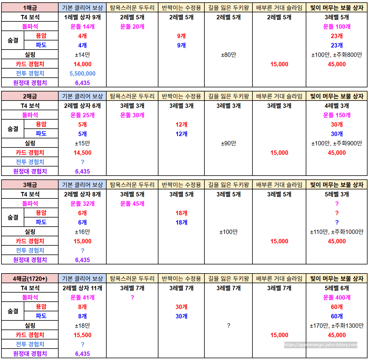 2T(청명/원해)변환 비용3T(멸화/홍염)변환 비용4T 승급 비용4T(겁화/작열)변환 비용Lv.13,000Lv.17,000ㅡㅡㅡLv.23,400Lv.28,500ㅡㅡㅡLv.34,000Lv.310,000300 Lv.1 7,000Lv.49,600Lv.420,000900 Lv.2 8,500Lv.510,000Lv.530,0002,700 Lv.3 10,000Lv.622,000Lv.660,0008,100 Lv.4 20,000Lv.736,000Lv.790,00024,300 Lv.5 30,000Lv.858,000Lv.8150,00072,900Lv.660,000Lv.980,000Lv.9210,000218,700Lv.790,000Lv.10127,000Lv.10340,000656,100Lv.8150,000ㅡㅡㅡㅡㅡLv.921..